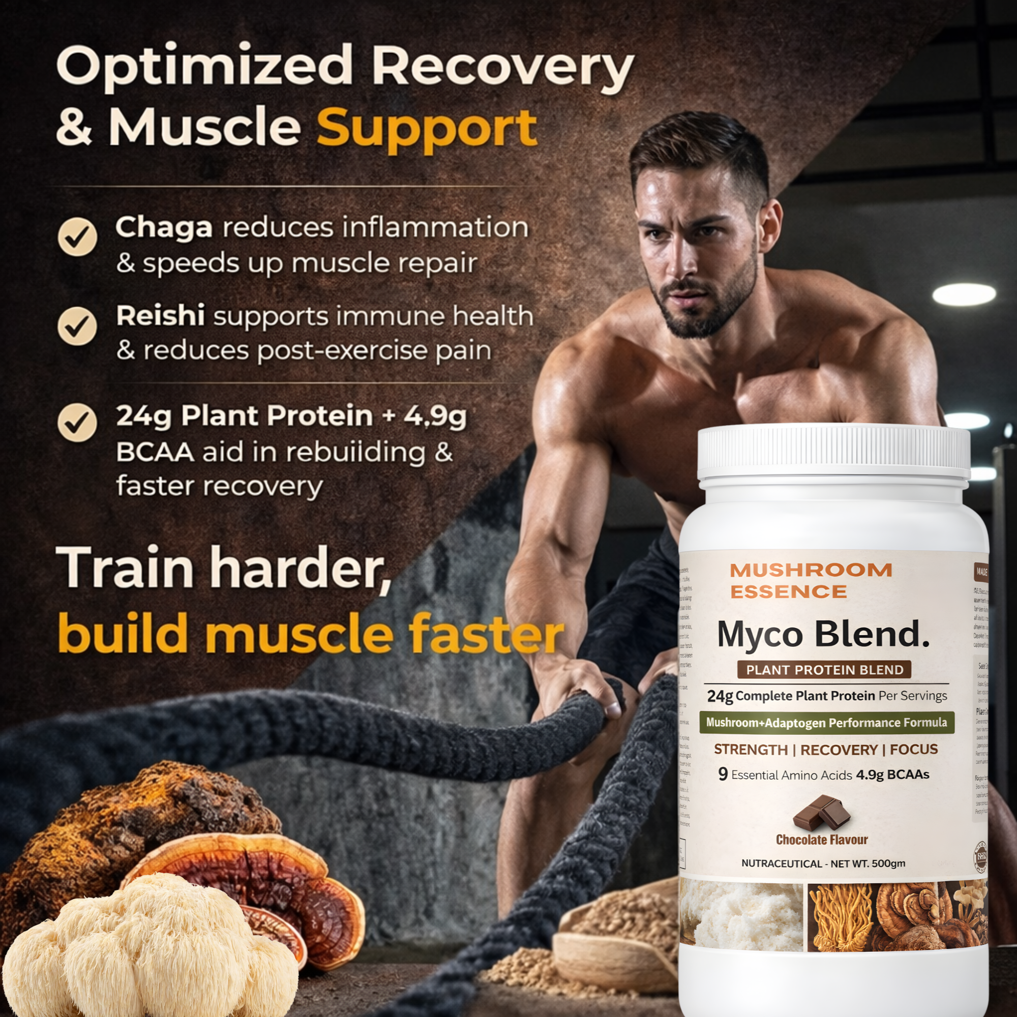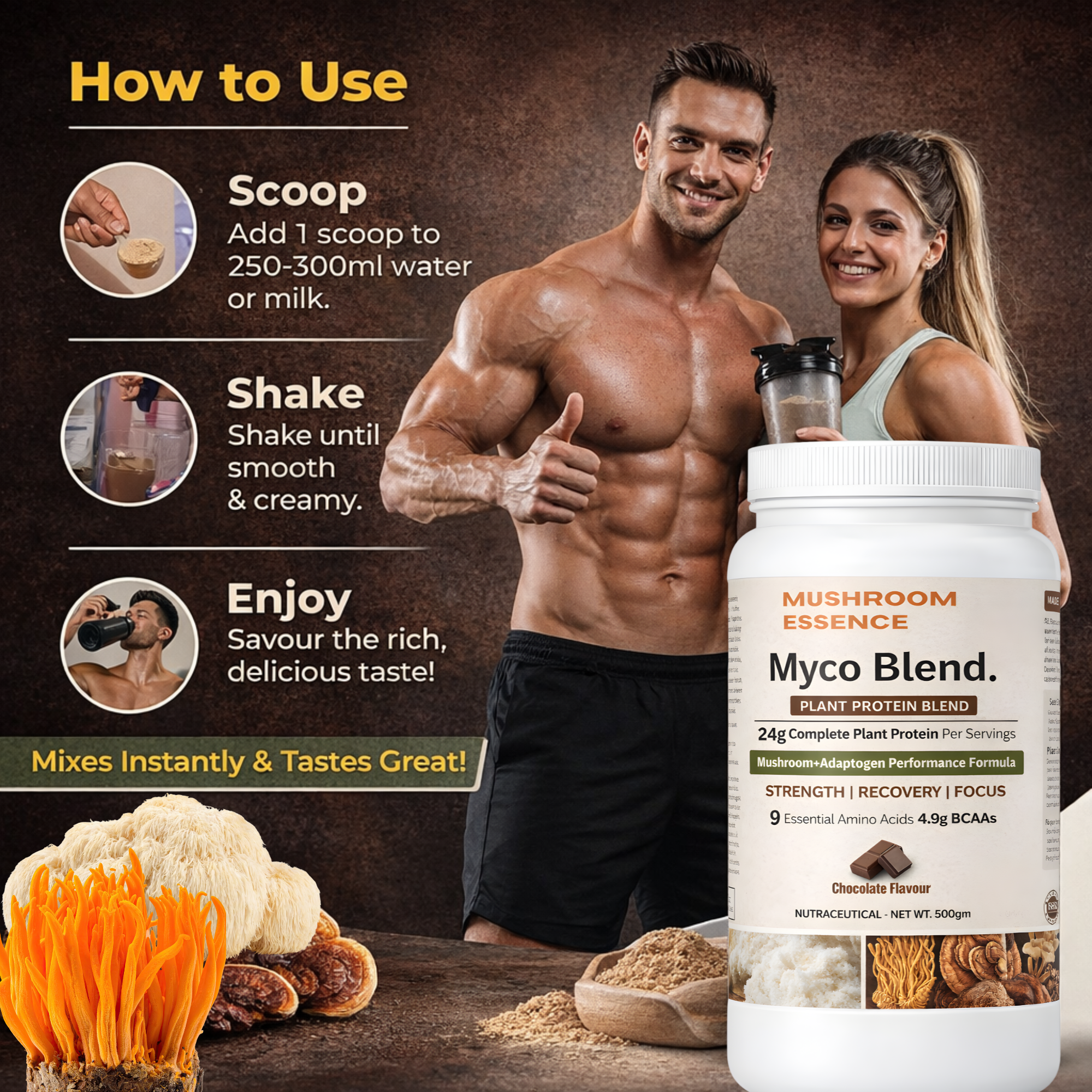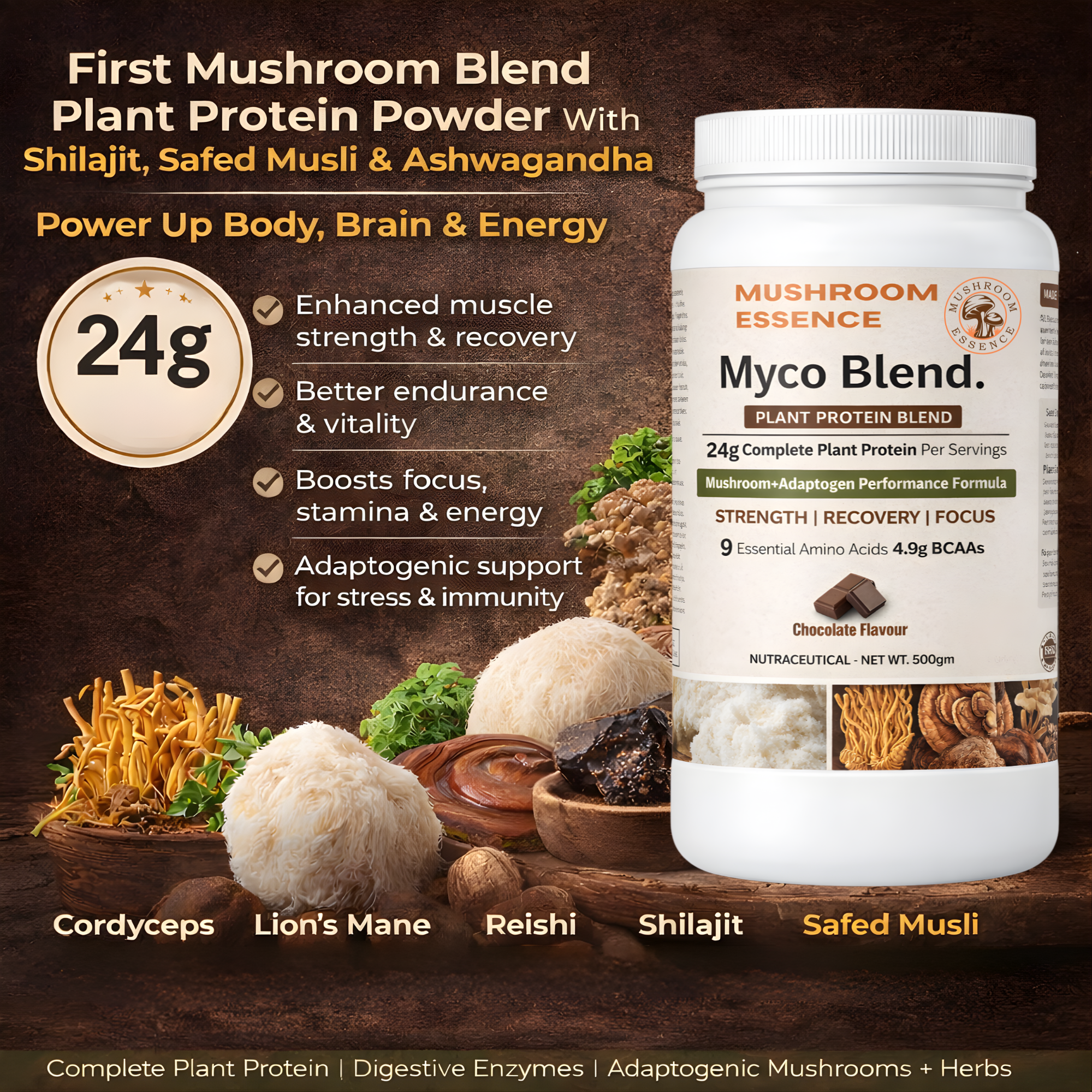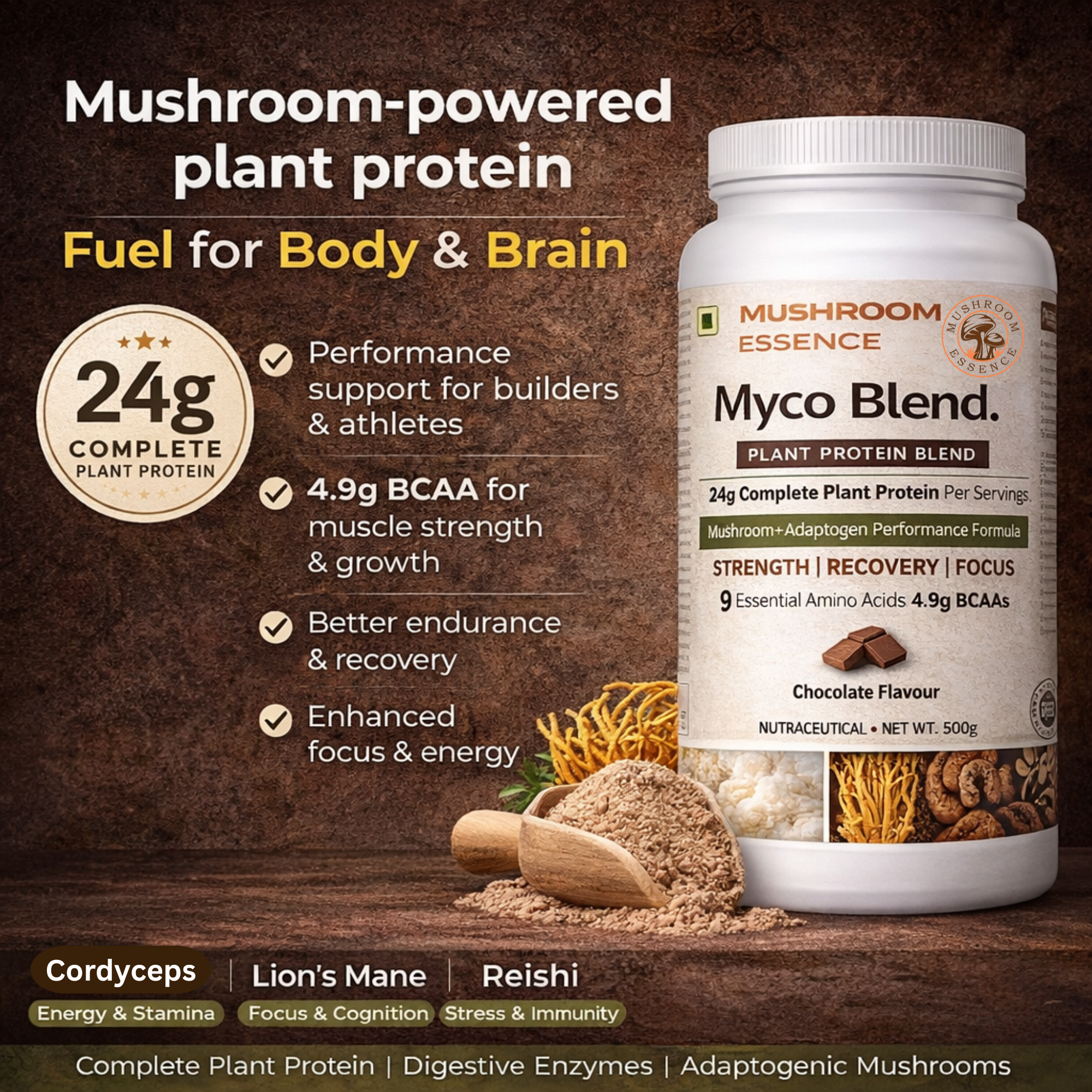 Mushroom Essence Myco Blend Plant & Mushroom Based Protein Powder-500gm | 24g Protein per Serving | Pea & Brown Rice Protein with Cordyceps, Lion’s Mane, Reishi ,Ashwagandha, Shilajit & Safed Musli | Chocolate Flavour